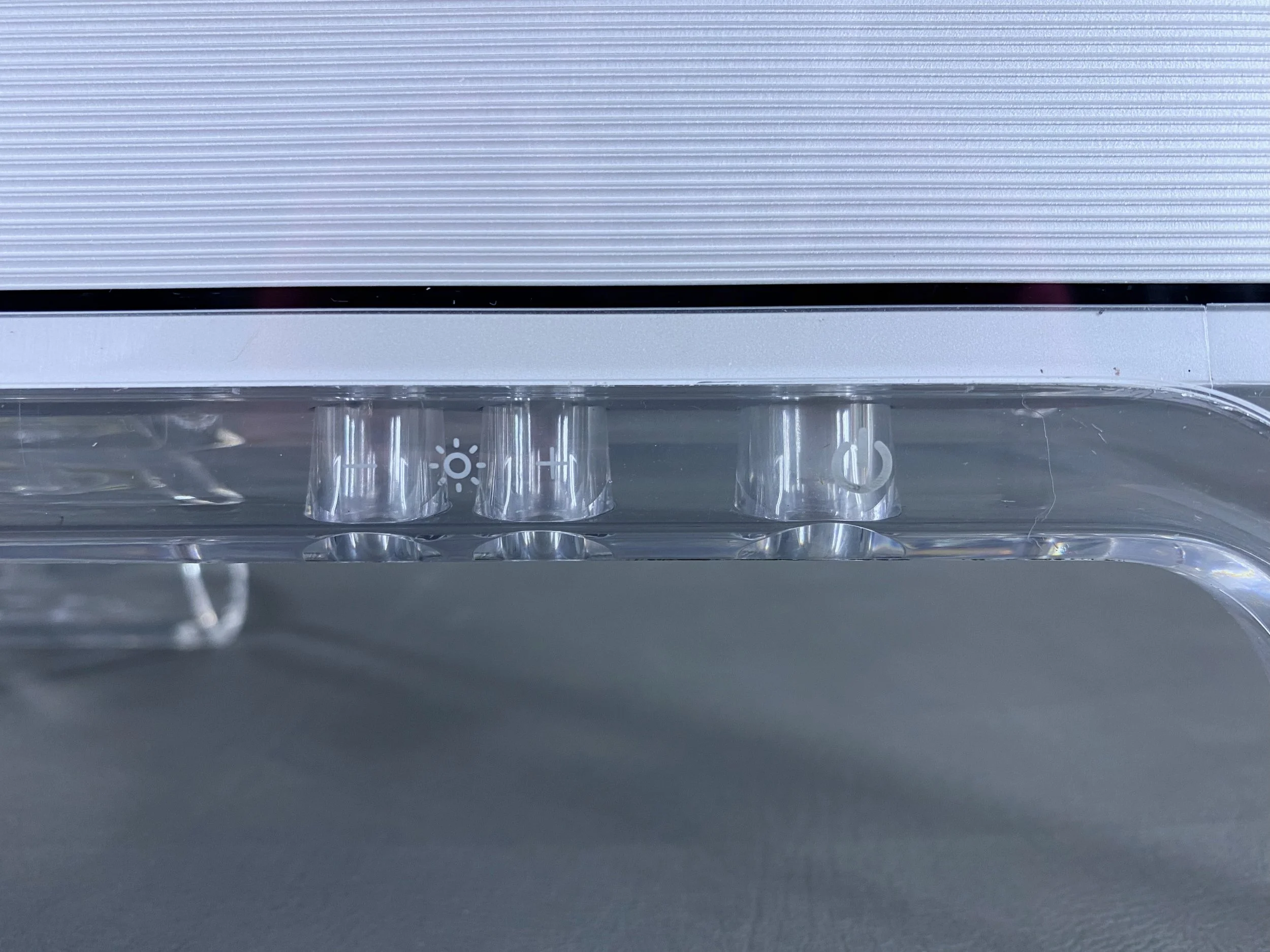 On the bottom-right of the display, there are physical buttons for power and brightness.