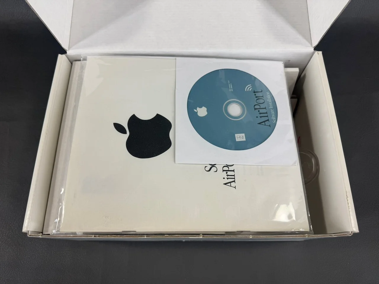 Print and disc media: Warranty info, setup guide, regulatory info, registration pamphlet, AppleCare info, and AirPort software disc.