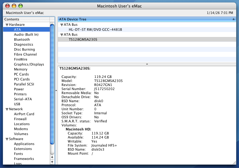 The eMac is known to suffer from leaky capacitors due to age, so in 2026 I had the motherboard and power supply professionally recapped. I also replaced the original 80 GB hard drive with a 128 GB SSD. Scroll to the bottom of the page for more on this.