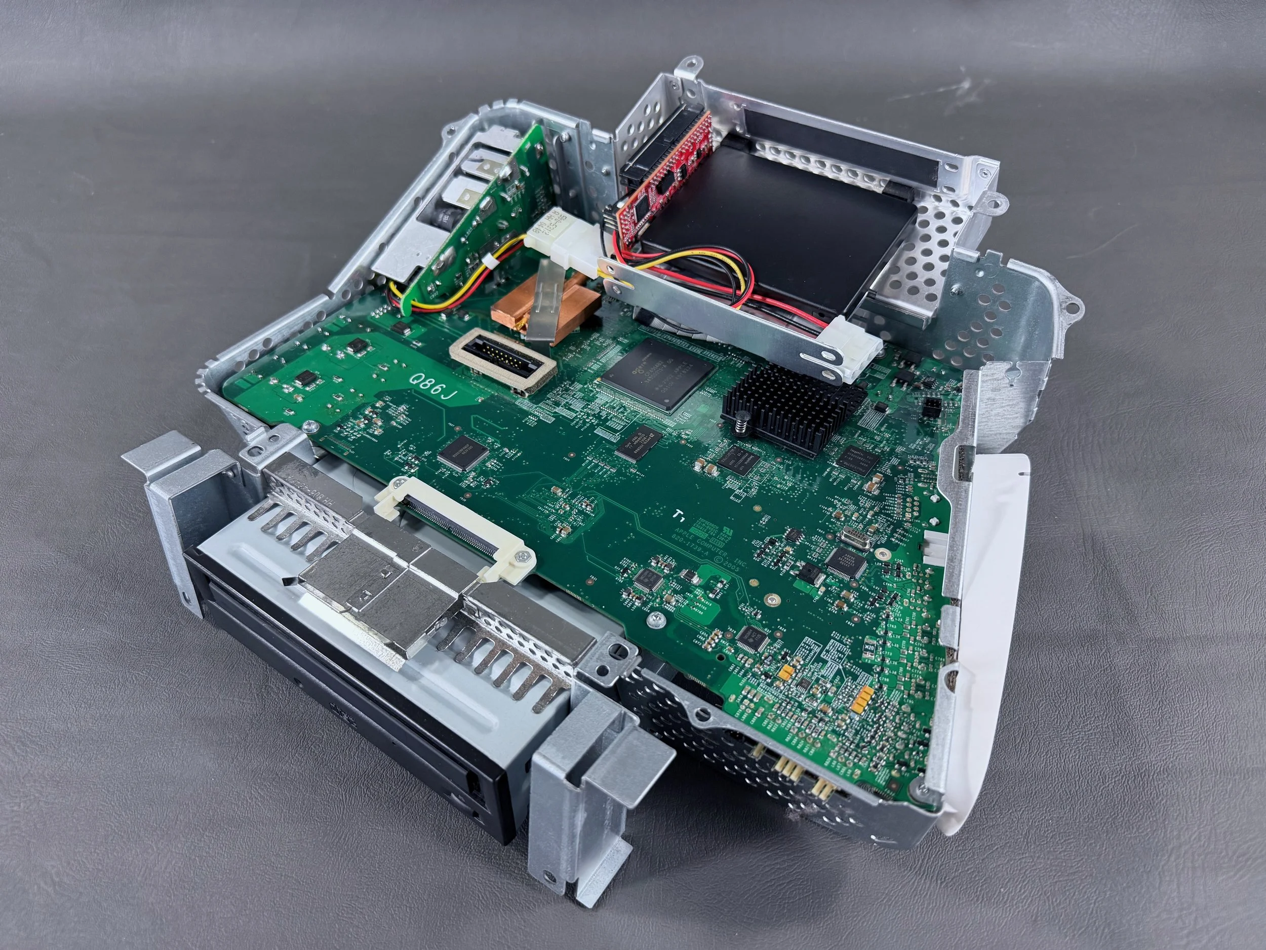 The new drive installed into the eMac’s logic board assembly. I used strong double-sided adhesive to mount it securely.