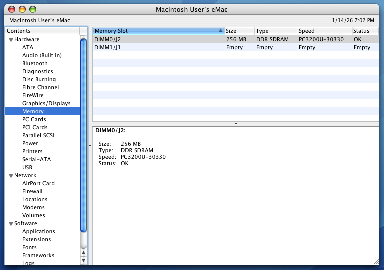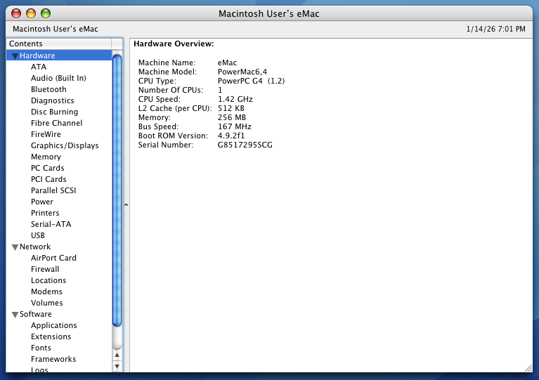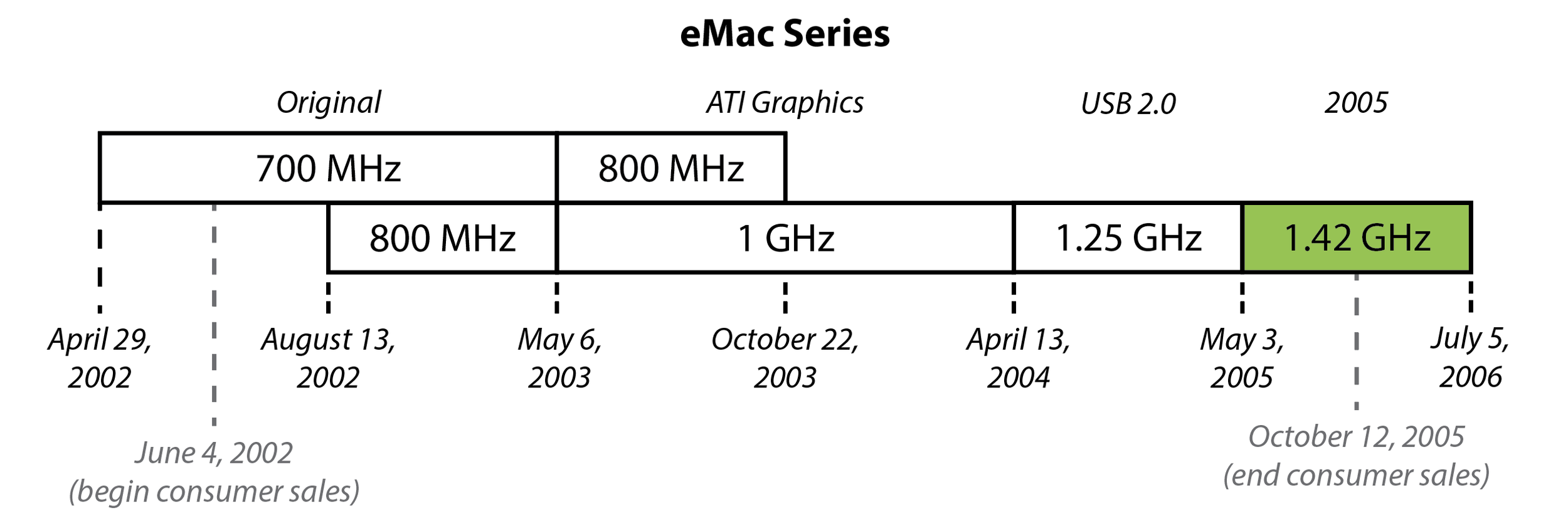 This particular machine is the 1.42 GHz model from 2005, the last and fastest model in the eMac line.