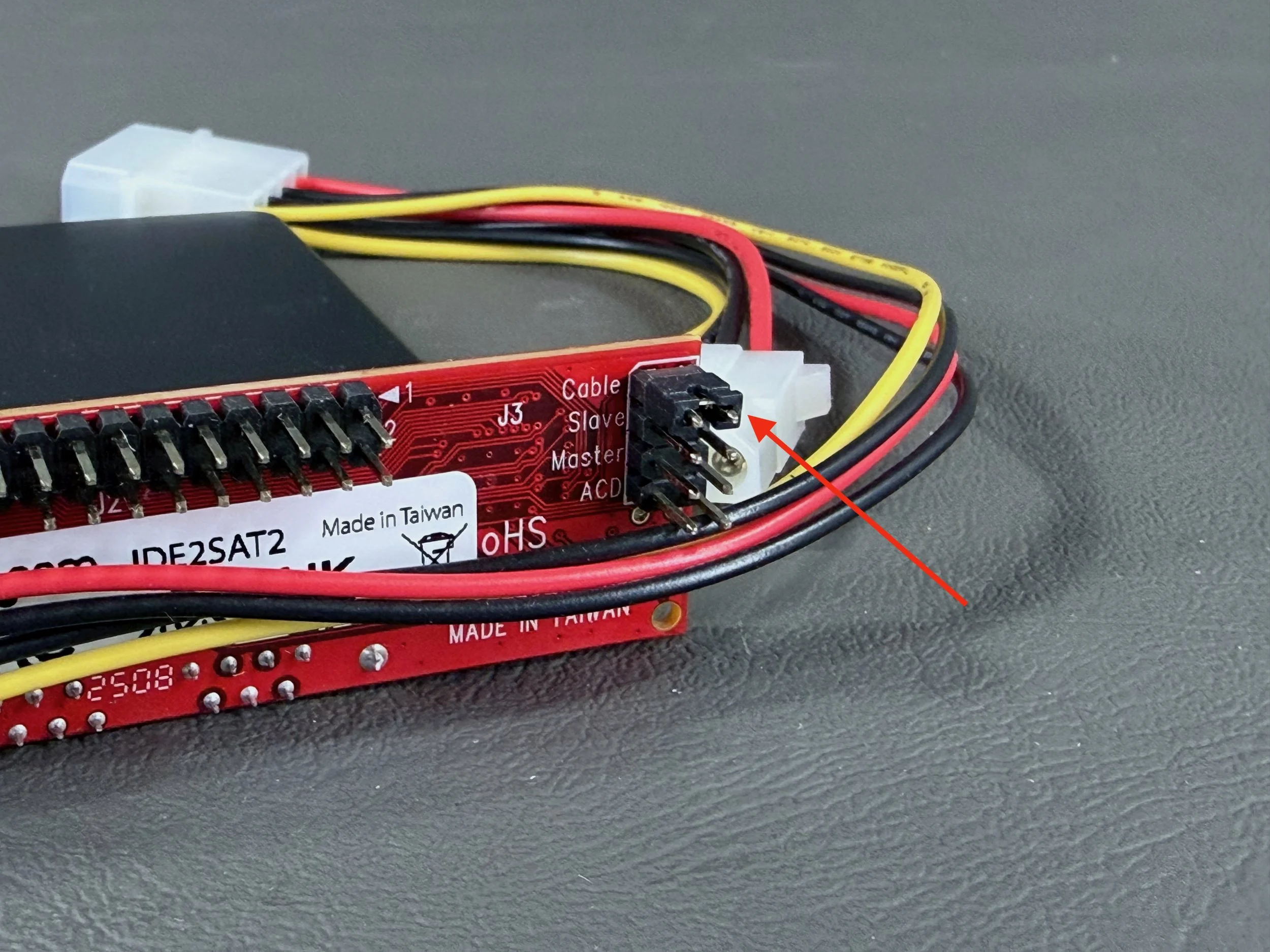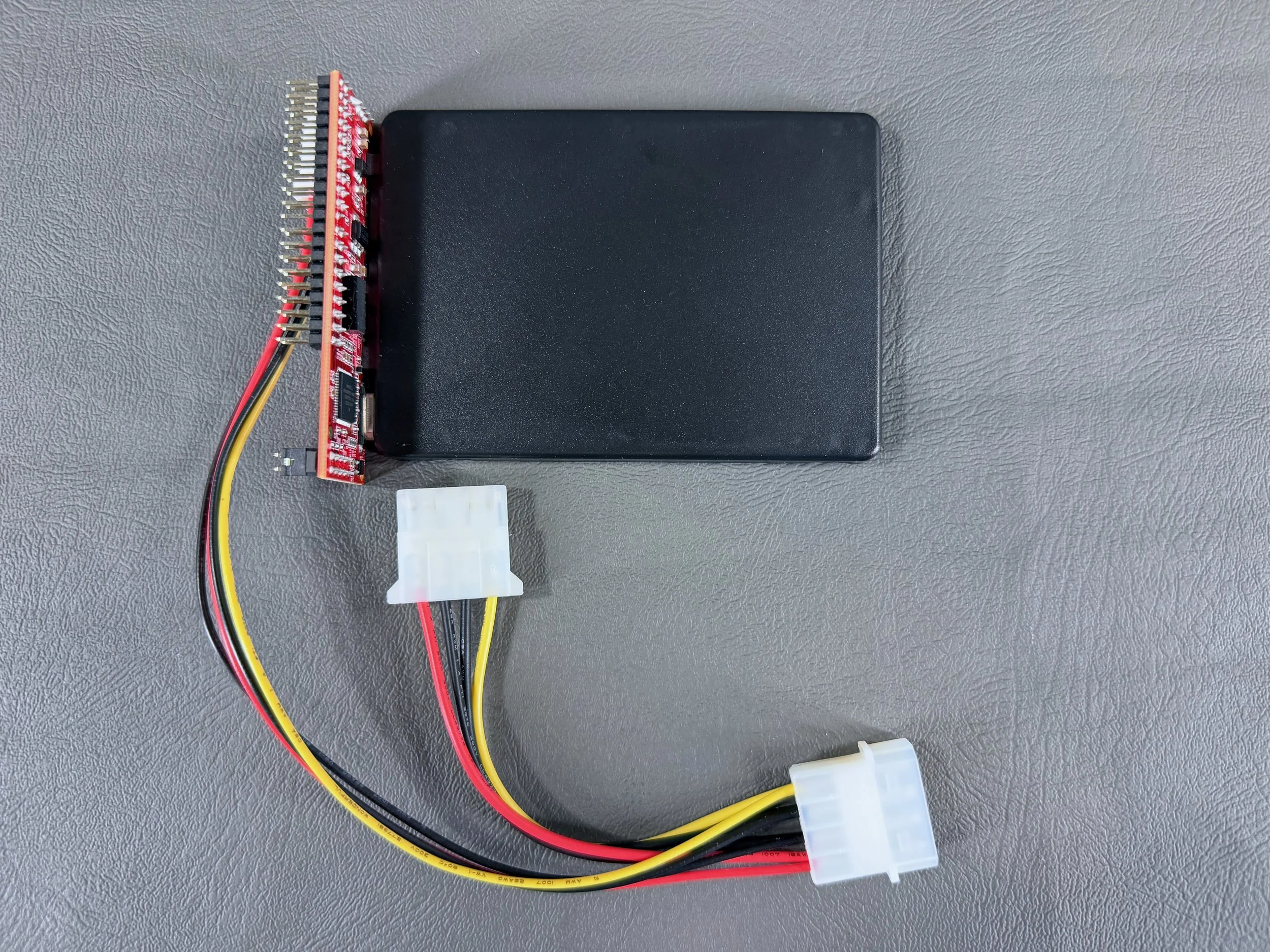 This is the red Startech IDE-to-SATA adapter, which is well-known to work nicely with many vintage Macs of this era. I have used them in many of my machines, including this eMac.