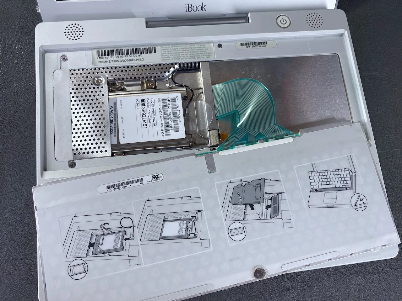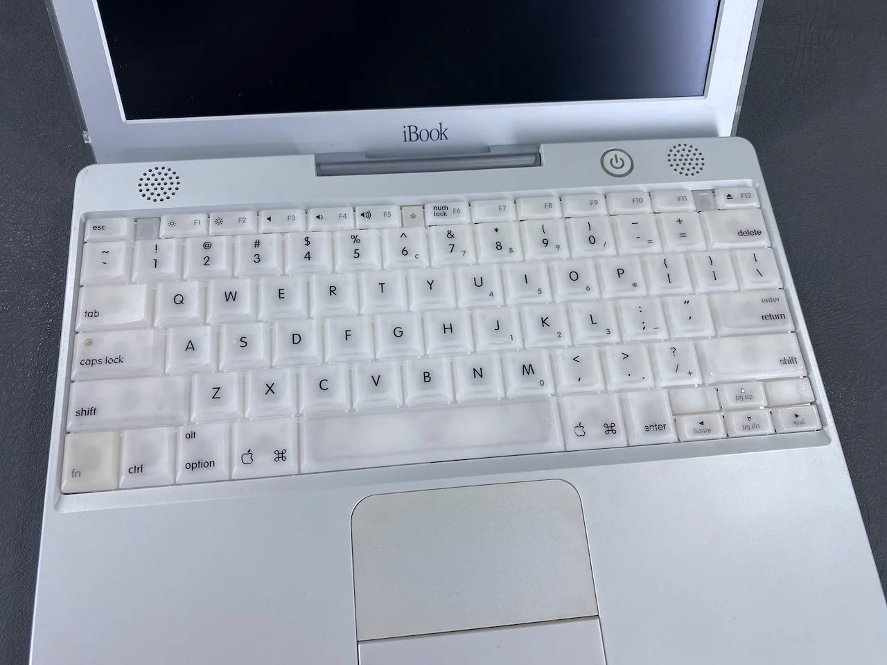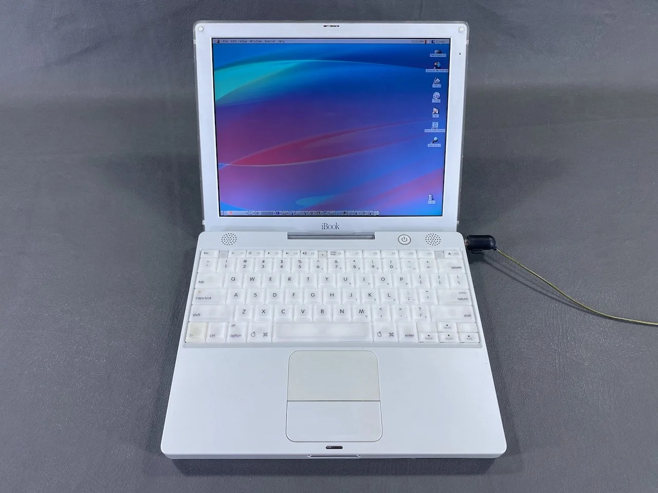 This particular model is the original 500 MHz ‘Snow’ iBook which directly succeeded the final clamshell iBook G3s.