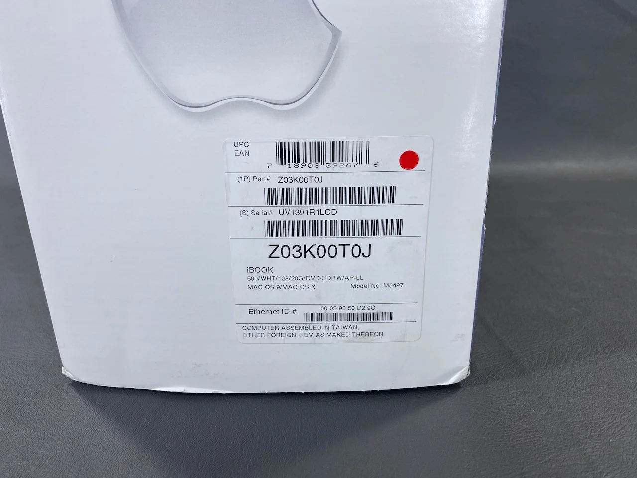 This iBook was originally purchased as a custom BTO directly from Apple’s website, with both the optional AirPort card and a ‘combo’ CD-RW / DVD-ROM drive installed straight from the factory (BTO being the only way at the time to get a combo drive in an iBook). The original invoice, packing slip, and receipt are still with the machine: the original order date is listed as 08/23/2001, and the ship date is 08/24/2001.