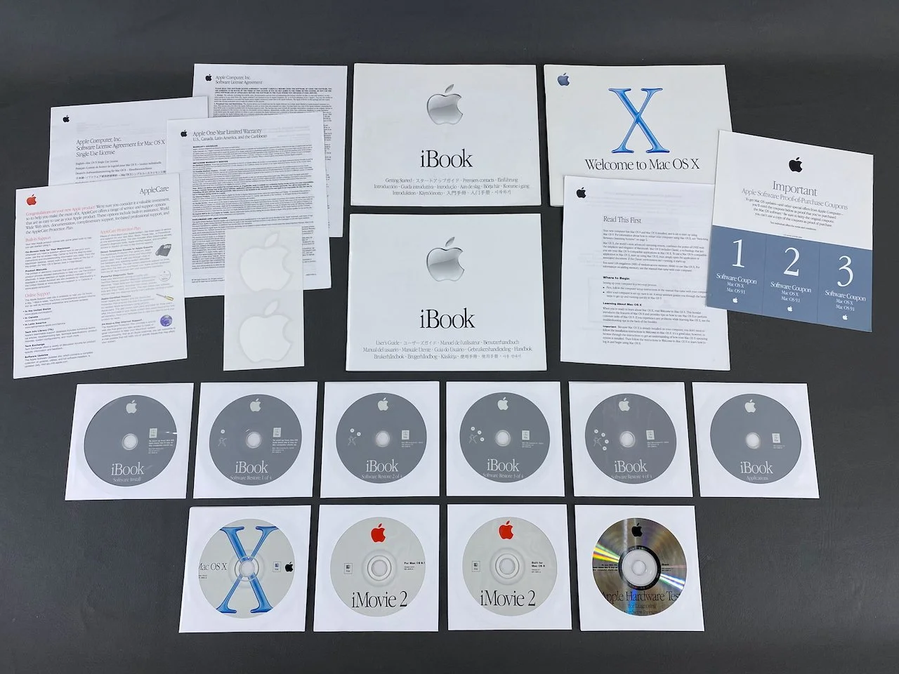 iBook Getting Started Guide, User’s Guide, OS X guide, dual-booting guide, software coupons, warranty and license info, AppleCare guide, Apple stickers, and software CDs: iBook Software Install, Software Restore (4), Applications, OS X install, iMovie 2 (OS 9 and OS X versions), and Apple Hardware Test.