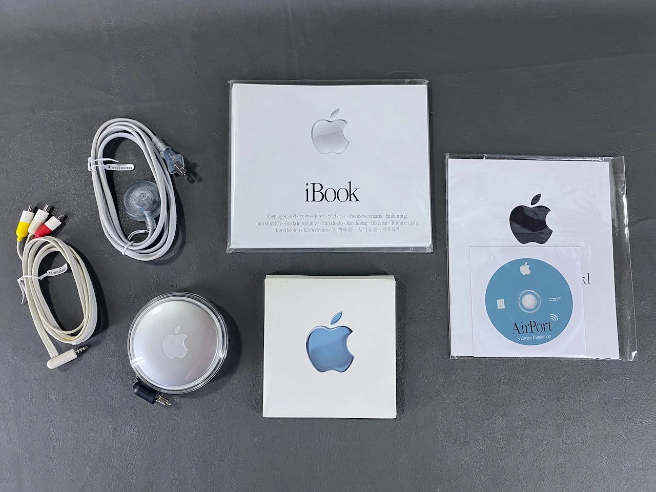 Main documentation, main software CD packet, AirPort documentation and CD, charger, AC cable, and OEM A/V cables. The A/V cables shown here were purchased by the original owner several months after the machine itself so they are NOT original to the system as it shipped from the factory.