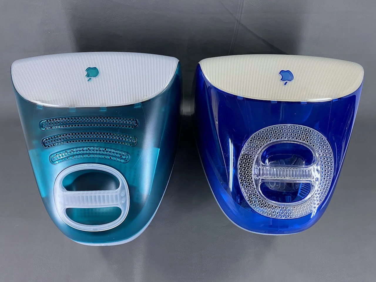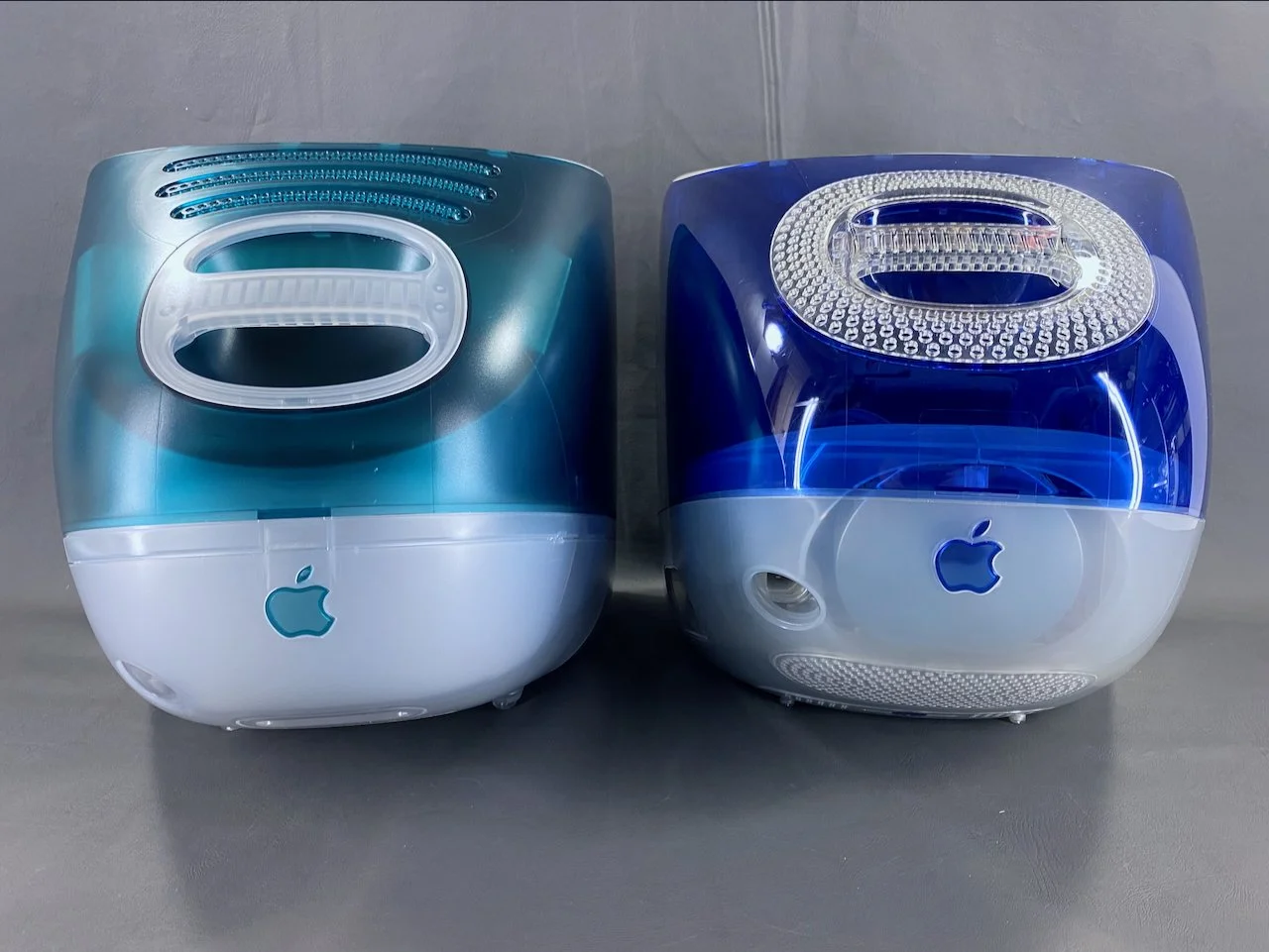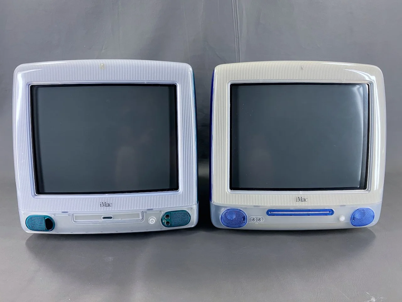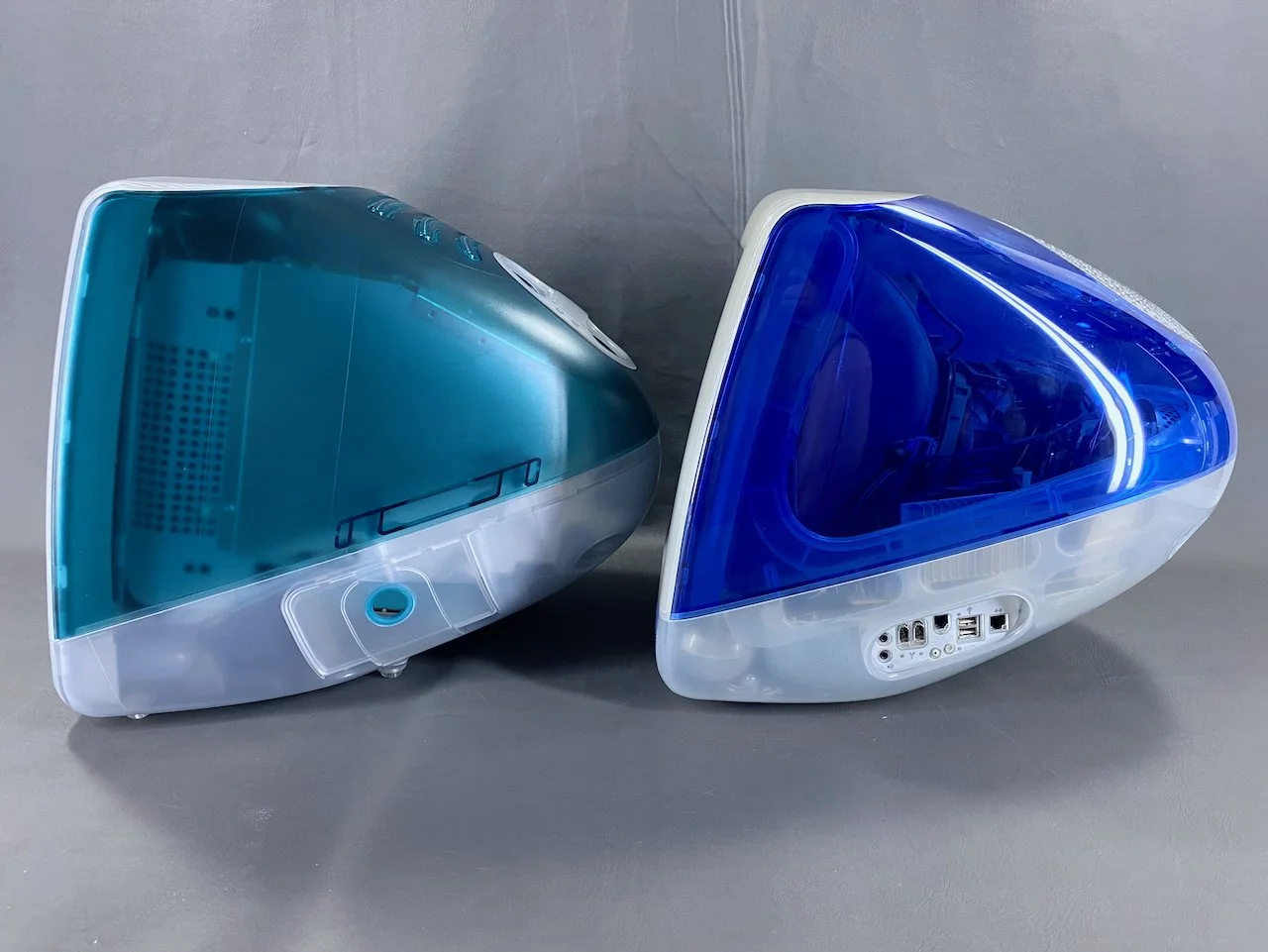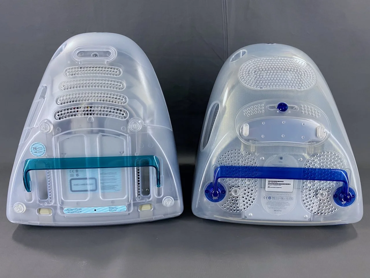 Tray-loading (Bondi Blue) iMac, left, next to a slot-loading (Indigo) iMac, right. I won’t get into all the specific differences between these machines, but suffice it to say that each one feels very different to use and work with relative to the other. As some examples, the tray-loaders have the I/O behind a door, whereas it is all exposed on the slot-loaders. The slot-loaders are also completely transparent all the way through the sides of the case, whereas the tray-loaders have shielding and boards in the way.