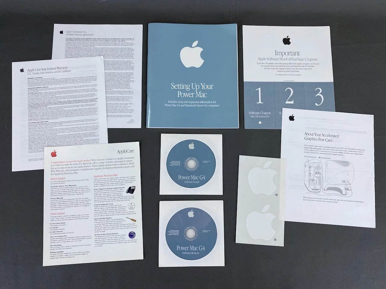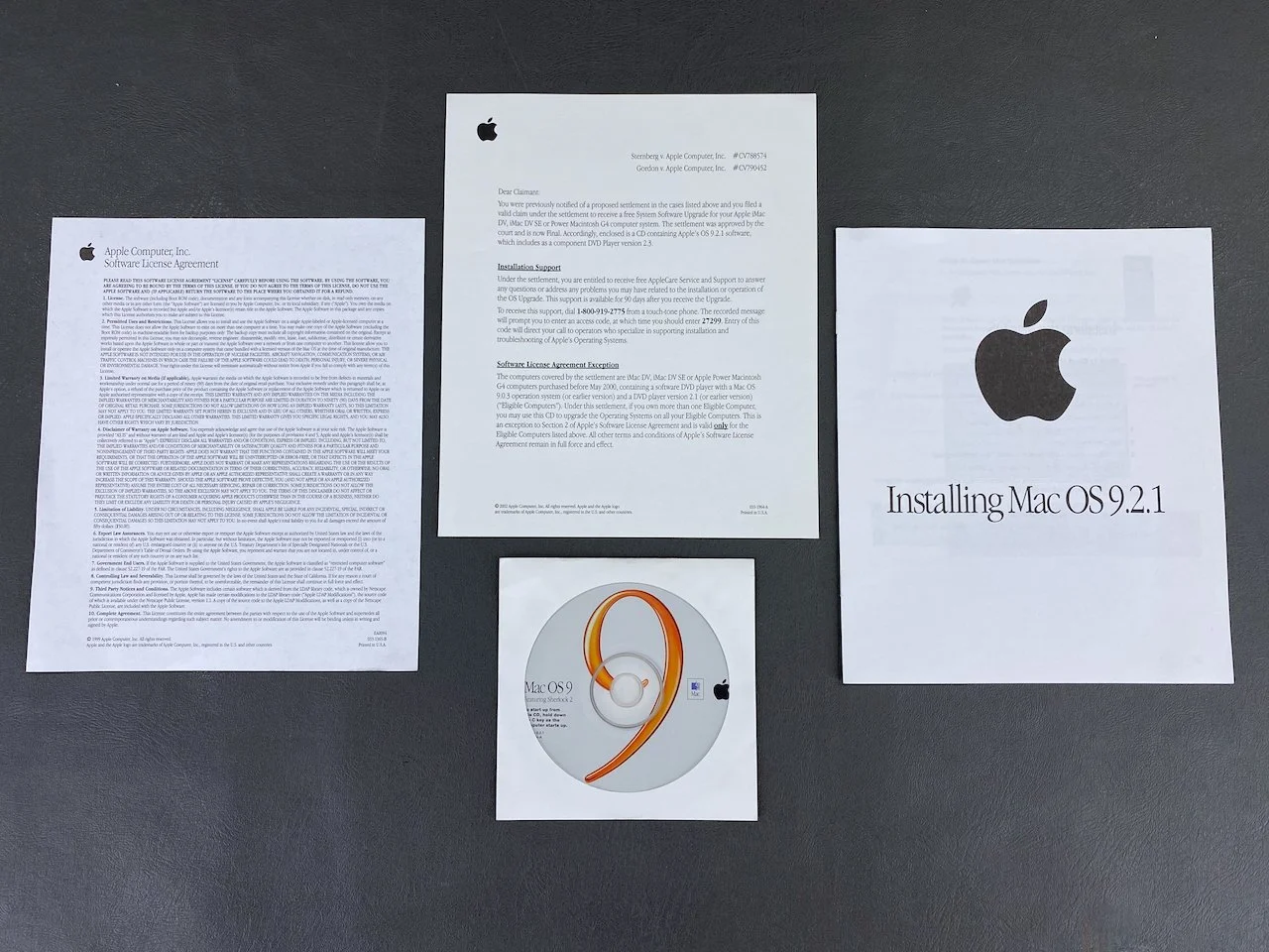 The original owner of this Power Mac G4 received these materials for OS 9.2.1 following a class-action lawsuit against Apple in 2002. You can read more details about this case here. So, they are not original to the machine but still neat to have.