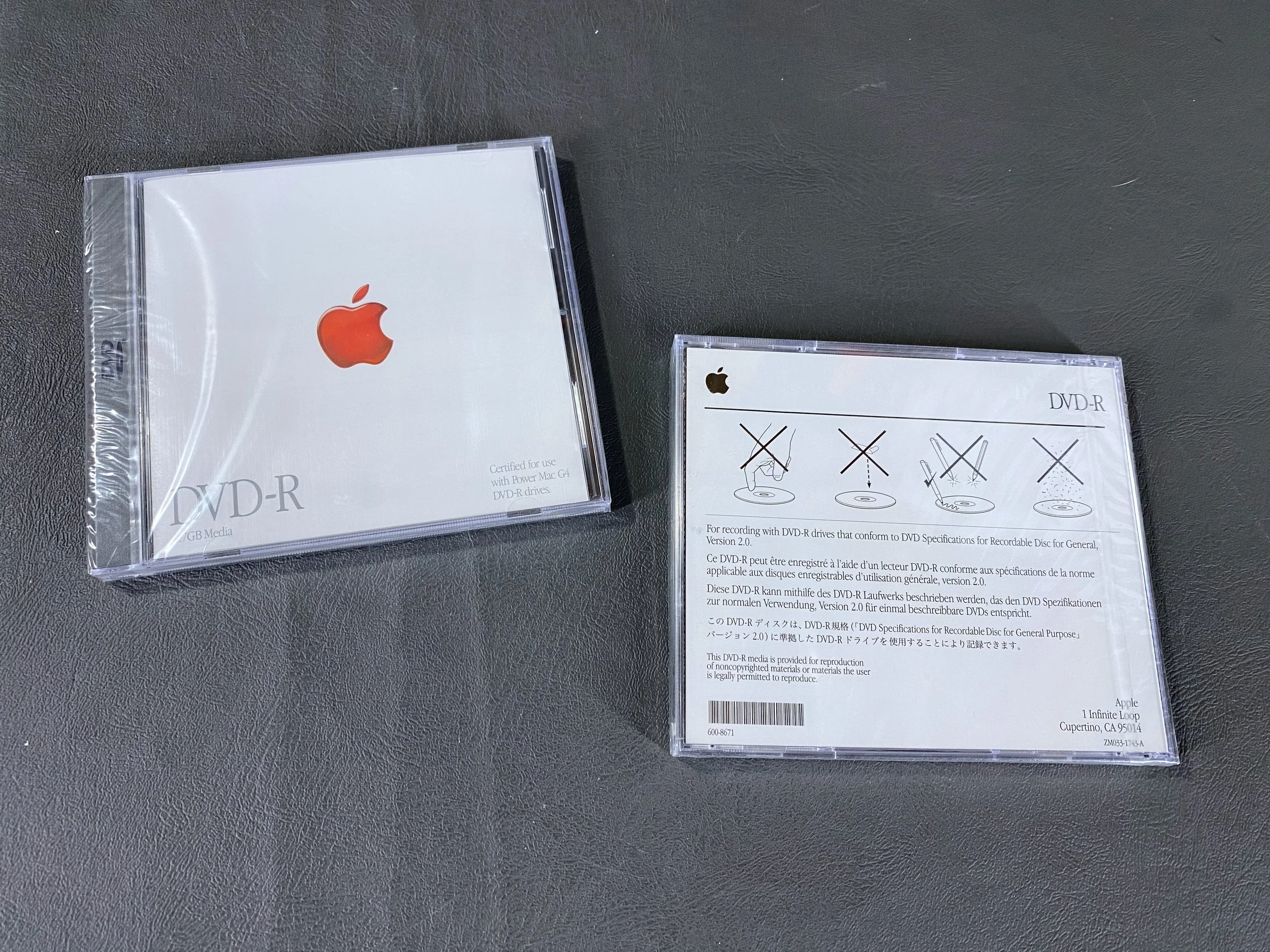 This machine hails from an era when DVD burners were hot new technology, something Apple was pushing heavily with its “SuperDrive” CD-RW/DVD-R drives, so they actually provided several blank DVD-R discs with Power Mac models like this one that were equipped with the SuperDrive. These discs shipped with this machine from the factory.