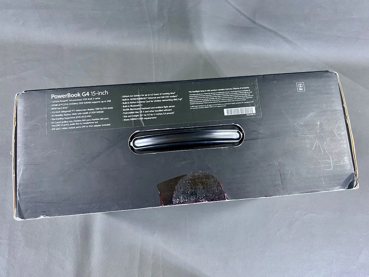 This unit is in excellent condition, with a few slight dings on the case. It is complete with all the original packaging, foam bag, power adapter, modem cable, DVI-to-VGA adapter, S-video-to-composite adapter, software CDs, and documentation. As is normal for a machine of this age, its battery is completely dead so it must be plugged in to AC power to operate.