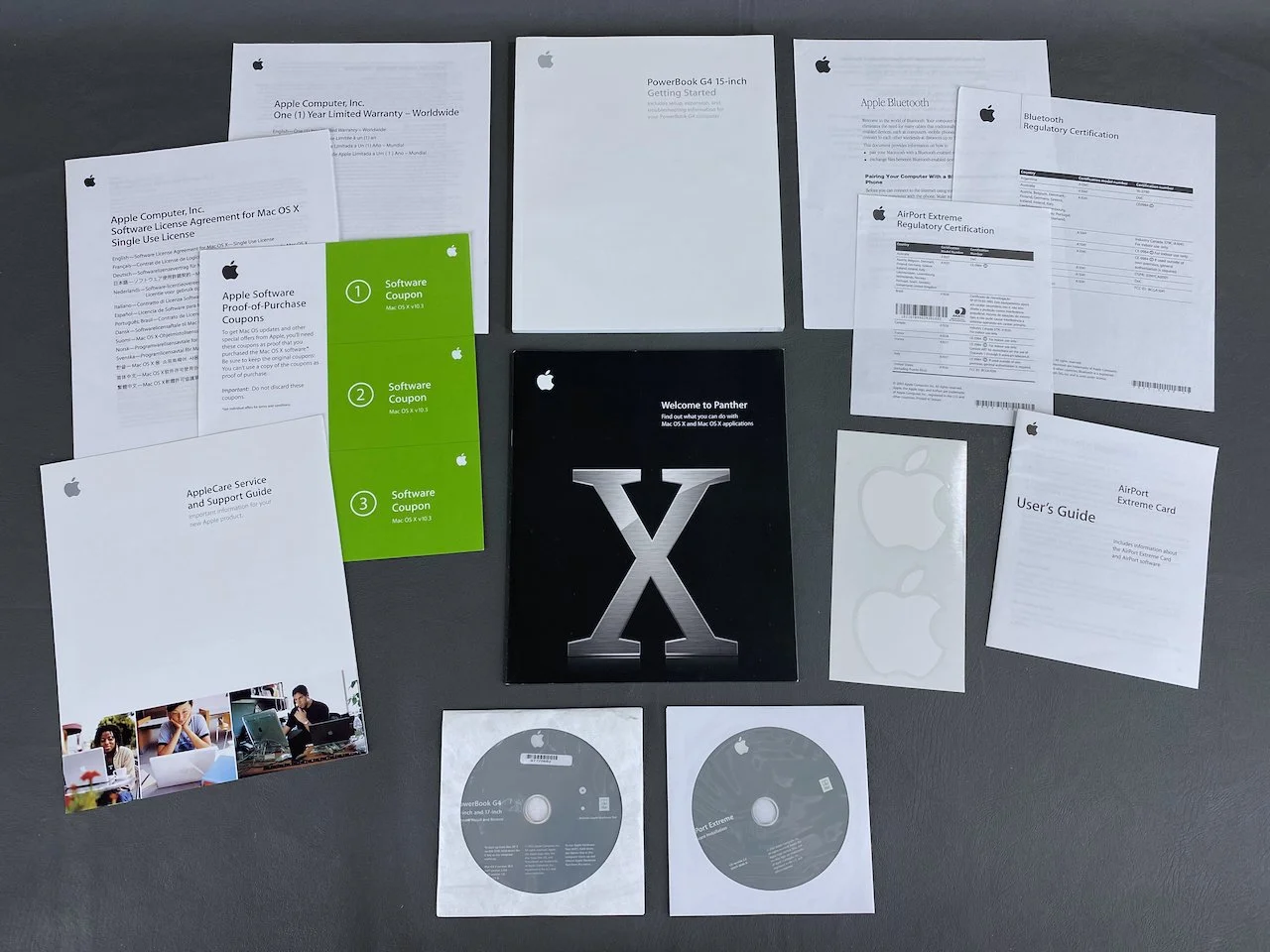 Getting Started guide, warranty info, software license agreement, AppleCare guide, OS X Panther documentation, software coupons, AirPort Extreme and Bluetooth documentation, PowerBook and AirPort Extreme software CDs, and the original Apple stickers.
