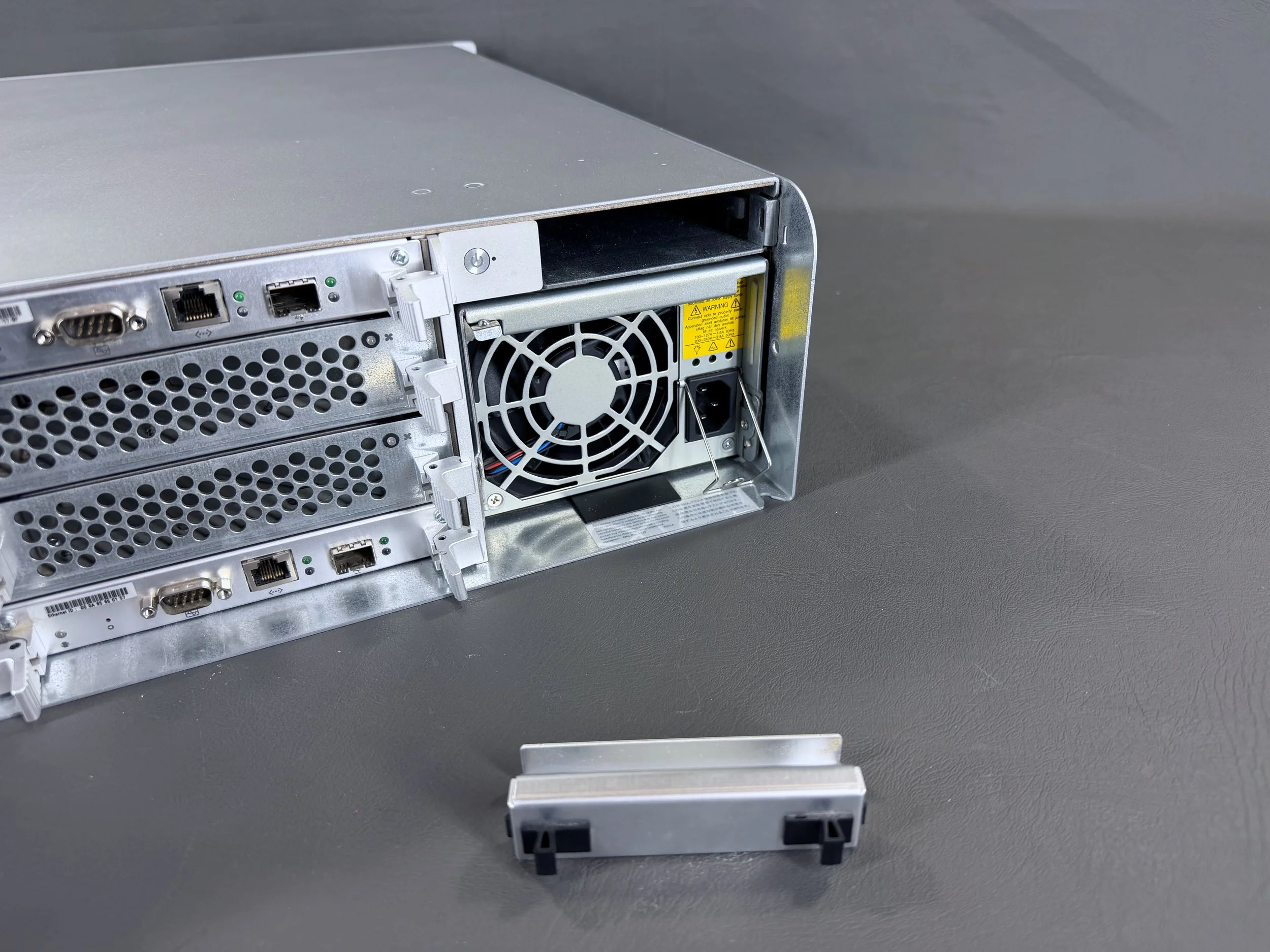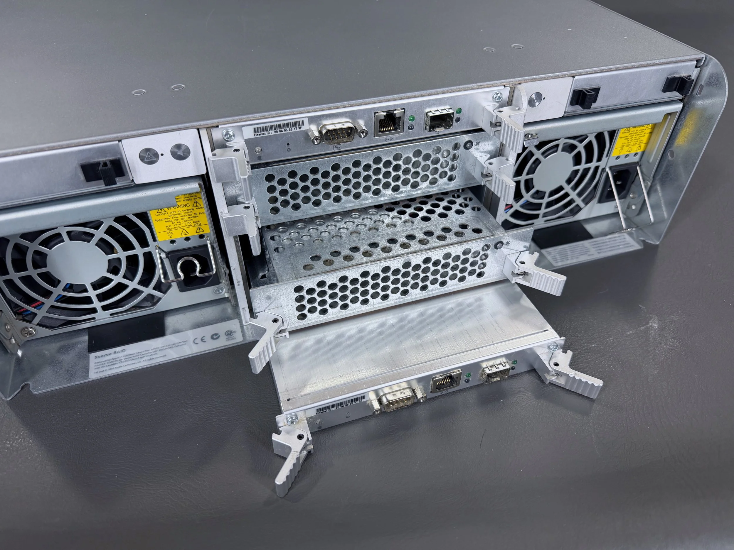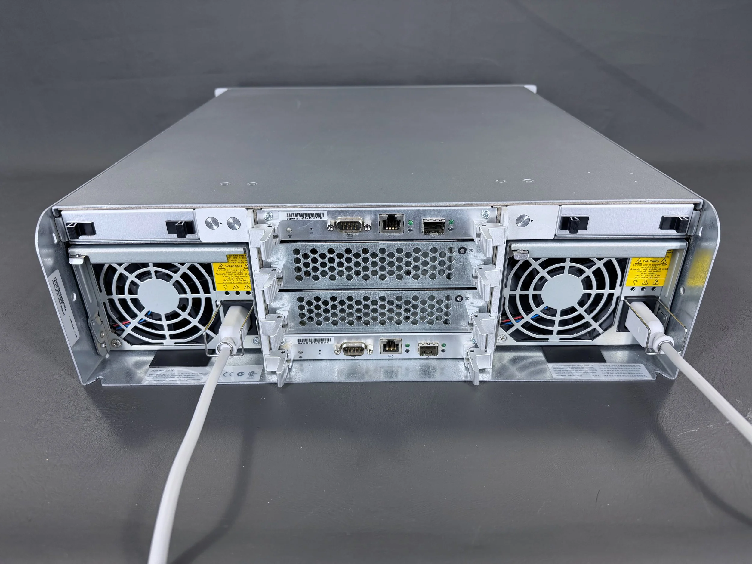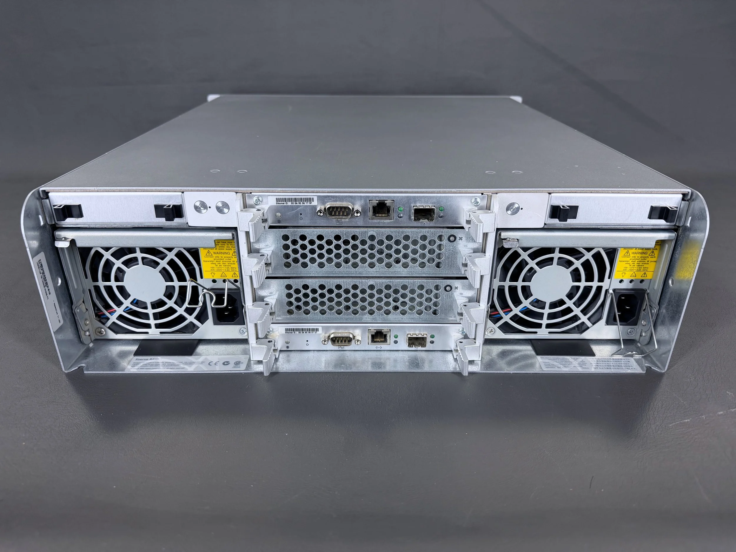 The Xserve RAID has two power supplies (left and right), along with the stack of four modules in the center.